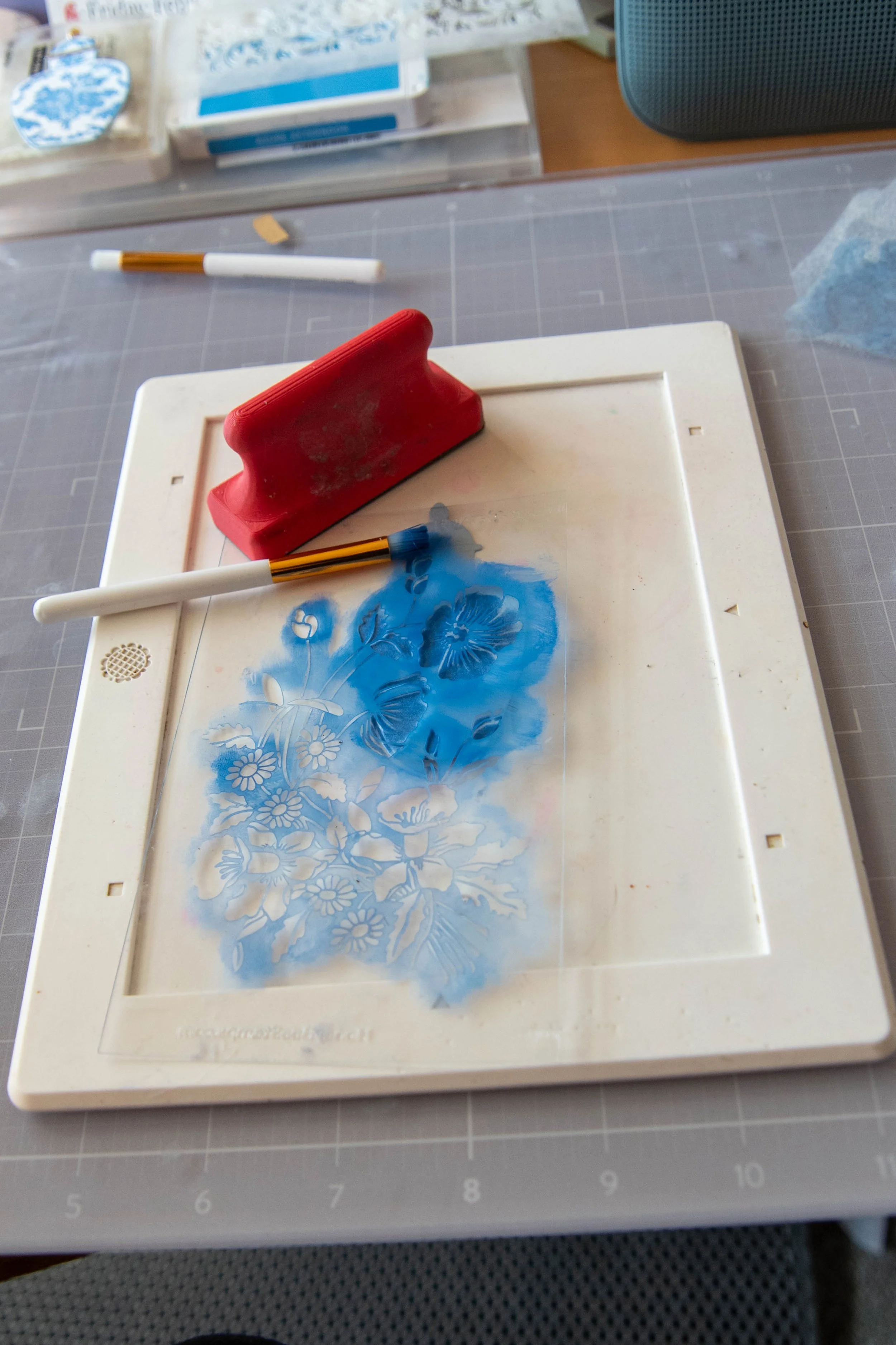 10. Take chinoiserie stencil from the Ginger Jar bundle and using the unicorn white pigment ink – stencil each side of the focal panel.