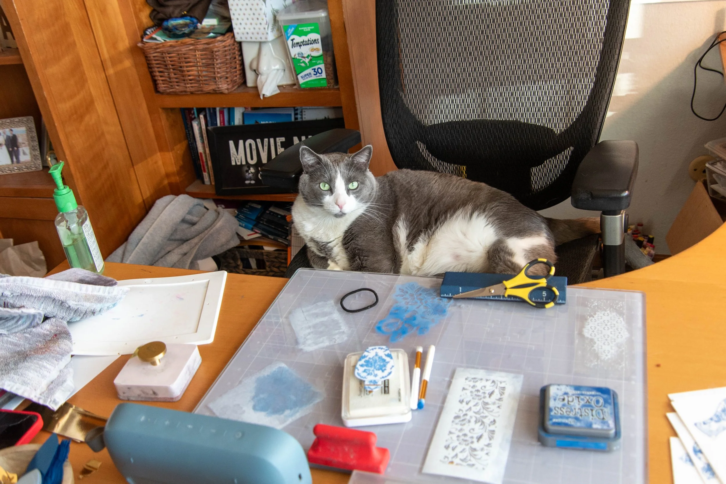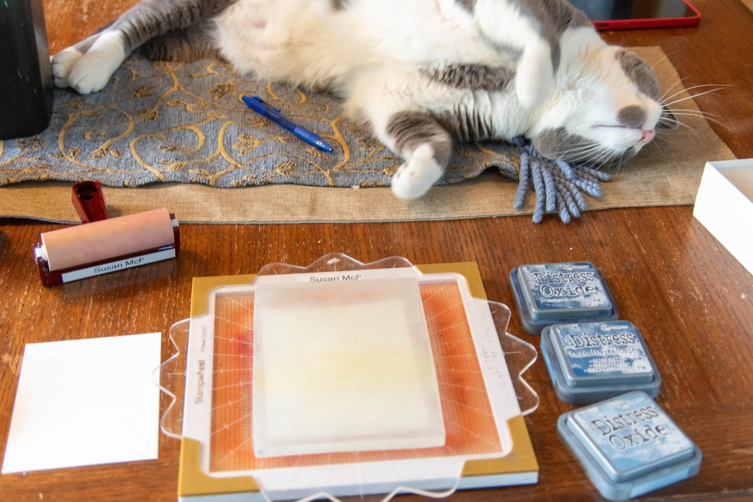 5. Adhere the gel press on glass or plastic plate. (I used the top of the alt-n-new stamp wheel)