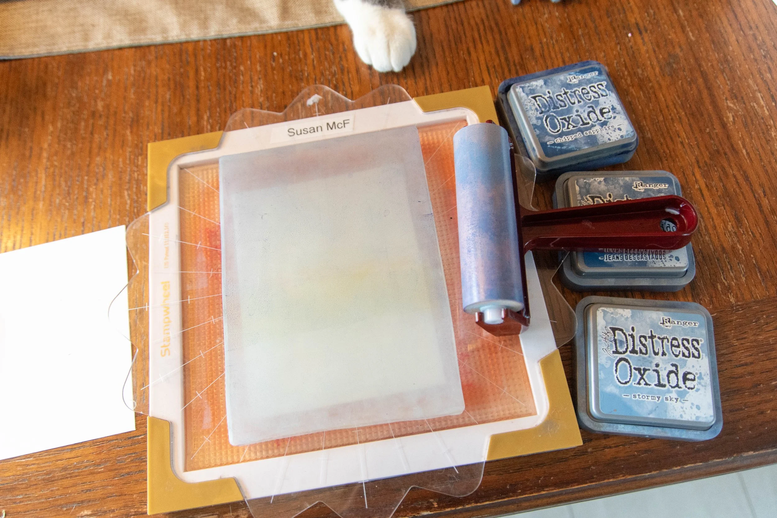6. Ink up the gel press in an ombre pattern starting from bottom to top with the inks: stormy sky, faded jean, and chipped sapphire. Use the brayer to blend – starting at the bottom then move to the top.