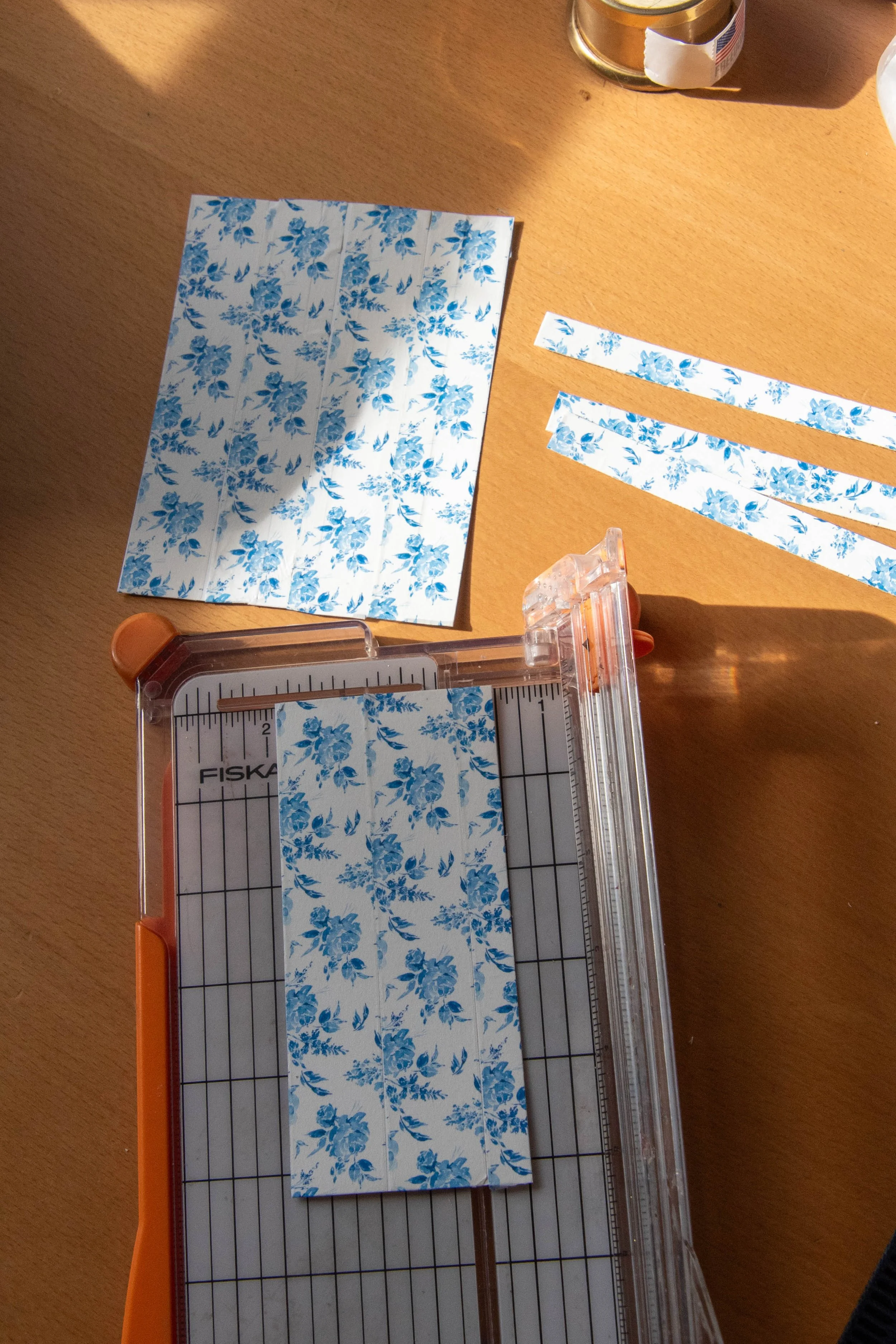 25. On a spare piece of paper apply the washi tape. Cut out ½” wide. Glue the washi onto the interior panel.