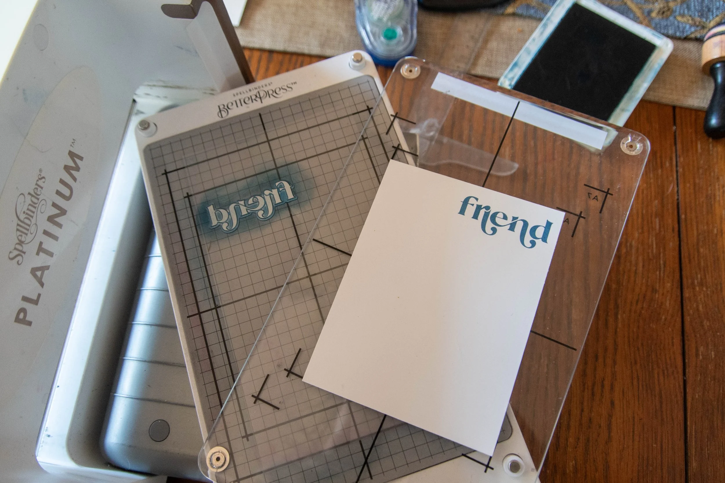 18. Using the “forever friend” plate, foil gold onto the seaside spray cardstock or blueberry bushel cardstock.